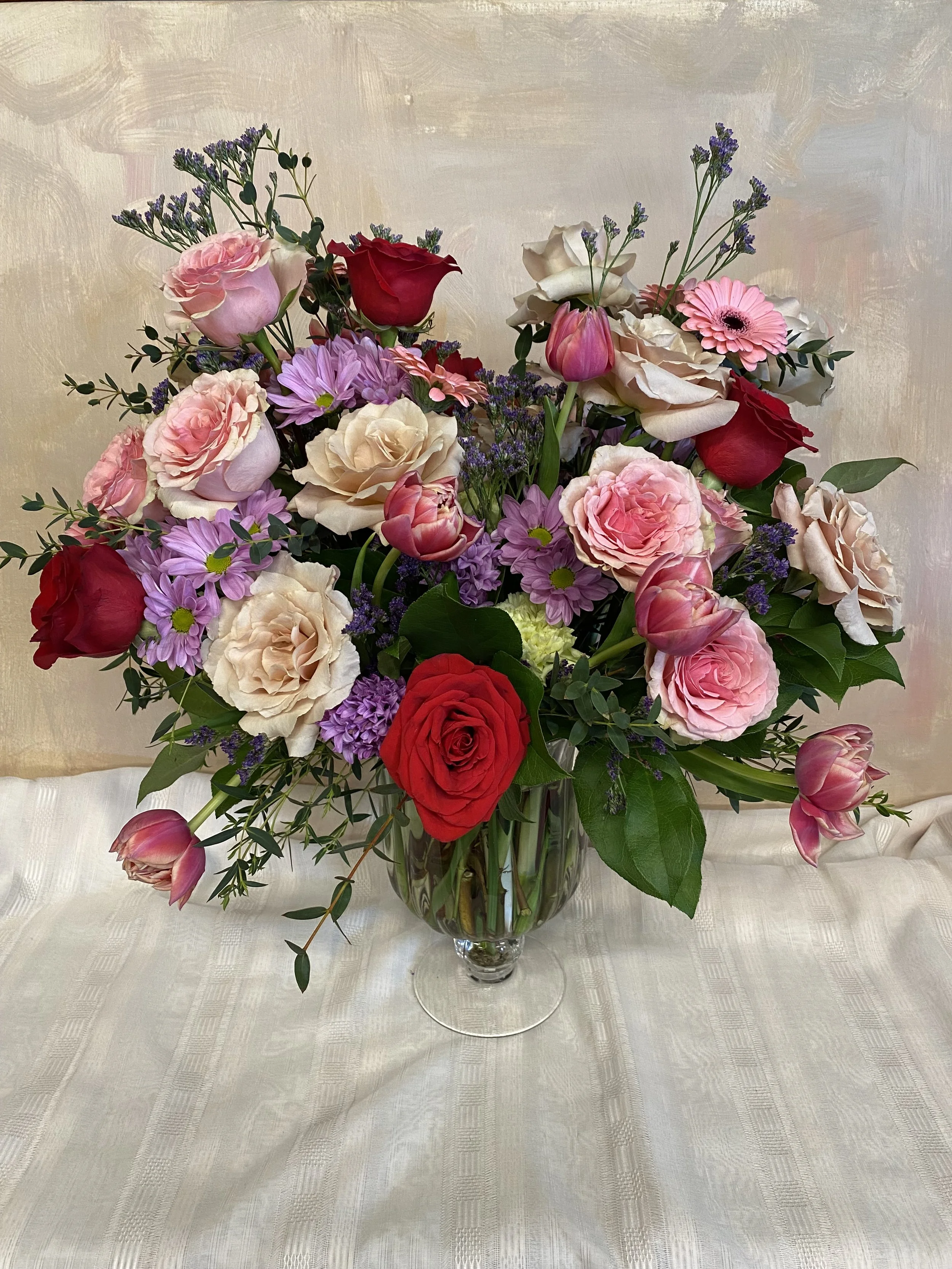 Our luxury arrangement consists of seasonal blooms in shades of red, pink, purple, and/or white with beautiful foliage* artfully displayed in a decorative compote.